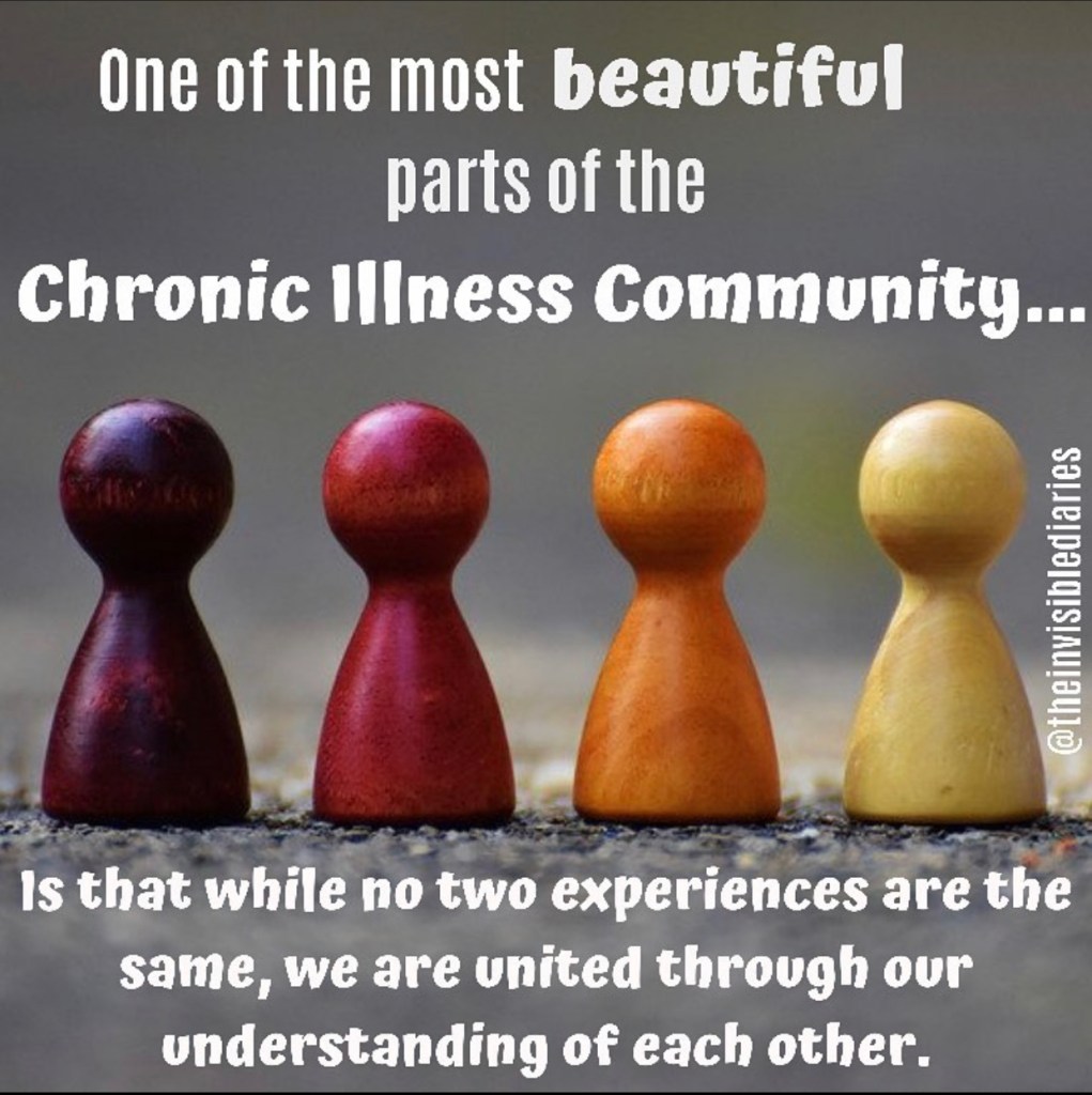 • Social Media is a great place to start. Facebook has a community group feature which is nice because of the privacy settings. Sometimes you want to be able to share, but also know that it stays inside the circle. Facebook fulfills that when you can’t find an in-person support group. Personally, Instagram helped me so much because of its searchable hashtag feature. I was able to find the #chronicillness community and for that, I will be forever grateful.